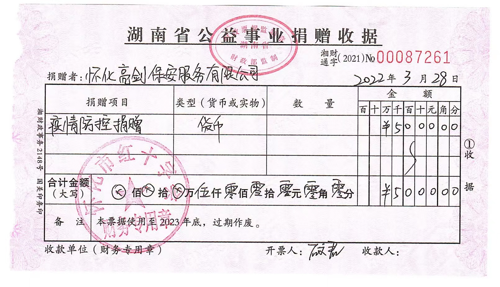 “一方有難,八方支援”。在抗擊疫情阻擊戰(zhàn)中,懷化金劍、亮劍保安服務(wù)有限公司聯(lián)合黨支部在積極響應(yīng)黨委政府號(hào)召,全力以赴投入疫情阻擊戰(zhàn)的同時(shí),組織開(kāi)展抗擊疫情捐款活動(dòng),以實(shí)際行動(dòng)踐行民營(yíng)企業(yè)的責(zé)任和擔(dān)當(dāng)。
