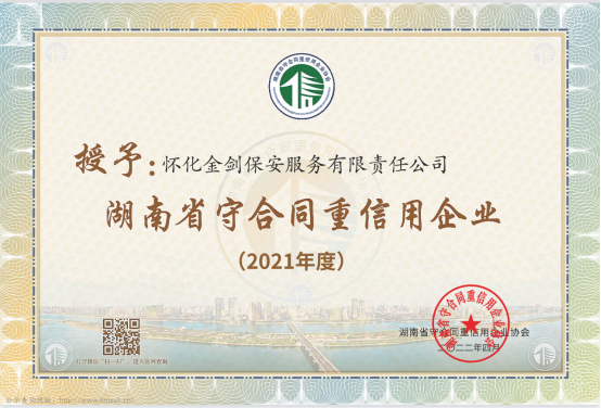 近日,懷化金劍保安服務(wù)有限責(zé)任公司、懷化亮劍保安服務(wù)有限公司憑借良好的市場(chǎng)信譽(yù)與優(yōu)質(zhì)的管理服務(wù),雙雙順利通過(guò)湖南省守合同重信用協(xié)會(huì)評(píng)審,榮獲2021年度“湖南省守合同重信用企業(yè)”榮譽(yù)號(hào)稱!