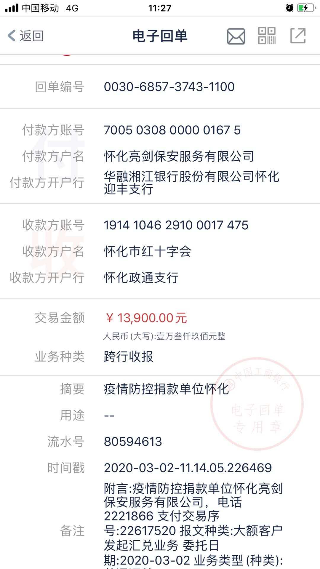 一方有難,八方支援。 懷化金劍、亮劍保安公司在組織保安隊(duì)員投入疫情防控阻擊戰(zhàn)的同時(shí),積極響應(yīng)以習(xí)近平同志為核心的黨中央的號(hào)召,為支持新冠肺炎疫情防控工作踴躍捐款。 該公司領(lǐng)導(dǎo)率先垂范,帶頭捐款,公司黨員、保安隊(duì)員踴躍參加捐款,以實(shí)際行動(dòng)支援抗疫工作。截止目前,全公司150余人自愿捐款1.3萬余元。