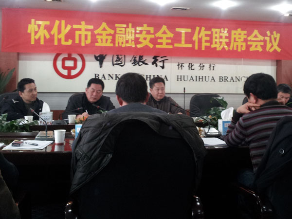 2013年1月15日下午3時(shí),懷化市金融安全工作聯(lián)席會(huì)議在中國(guó)銀行懷化分行會(huì)議室勝利召開。會(huì)議由懷化市公安局治安支隊(duì)政委肖守元同志主持,參加會(huì)議的有懷化市公安局黨委委員丁繼元同志、懷化市銀監(jiān)局紀(jì)委書記陳勇同志、以及各專業(yè)、商業(yè)銀行主管安全保衛(wèi)工作的副行長(zhǎng)、保衛(wèi)處、科長(zhǎng)、武裝押守公司、懷化金劍保安公司、市保安協(xié)會(huì)領(lǐng)導(dǎo)等。