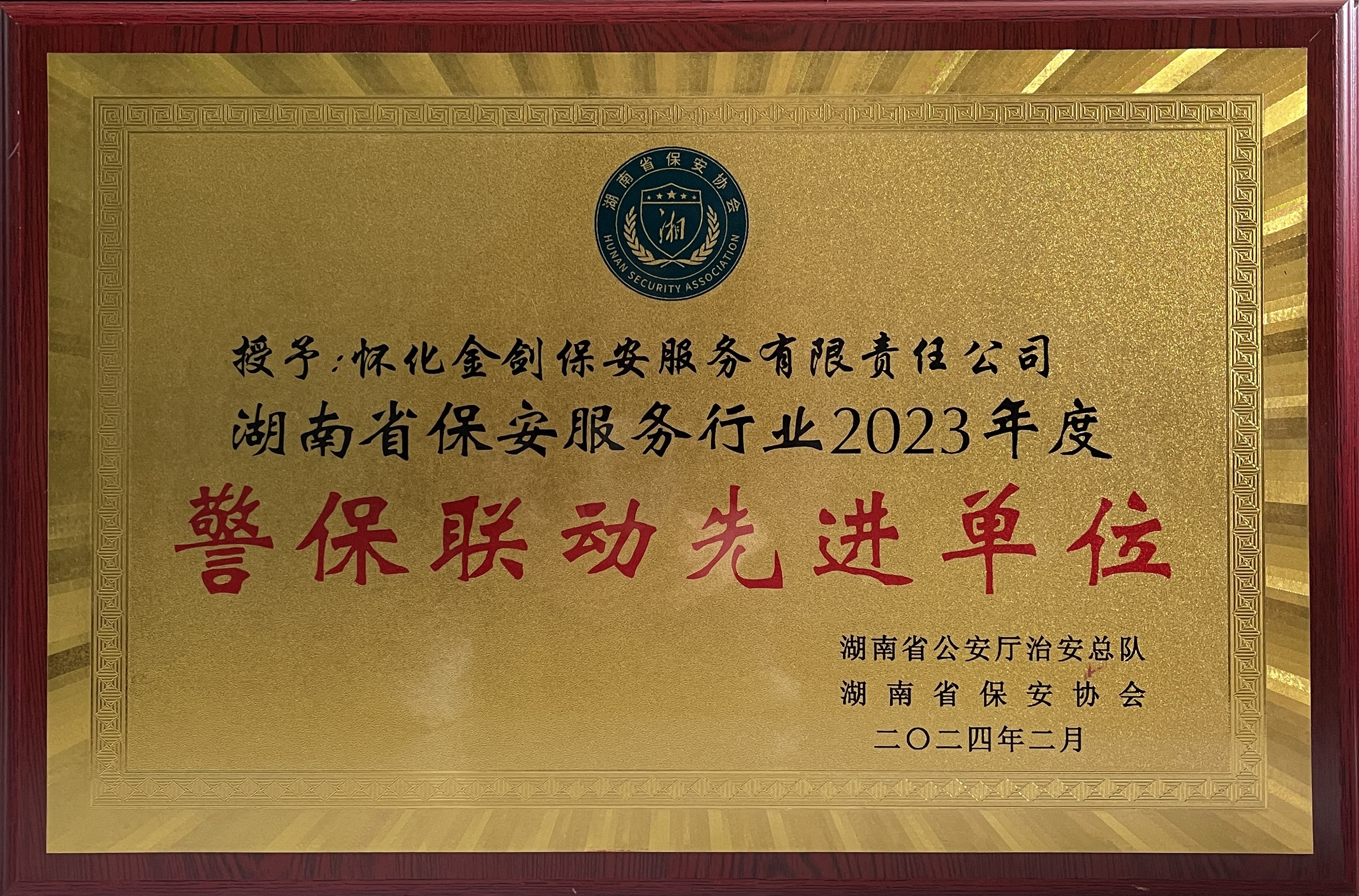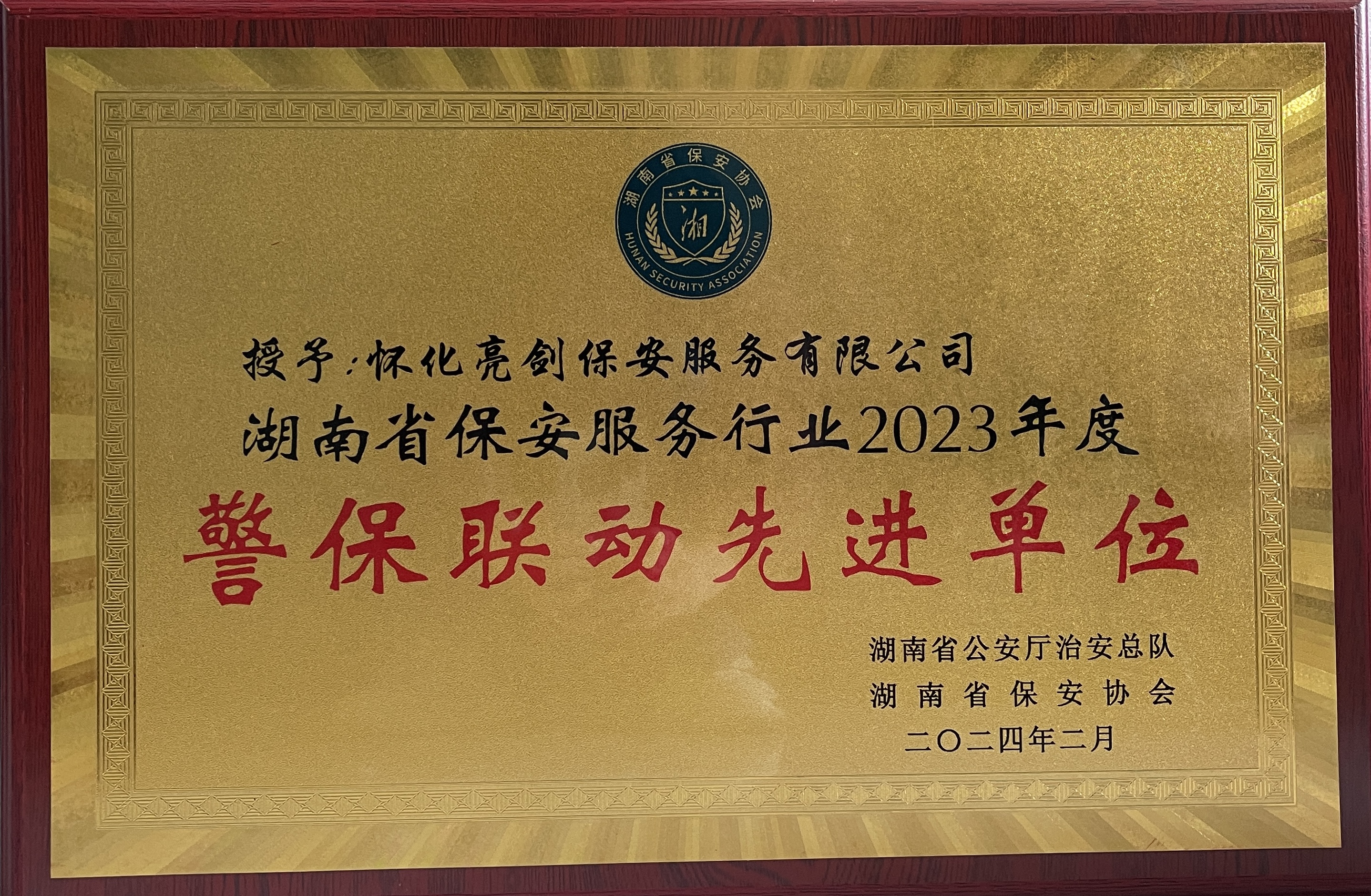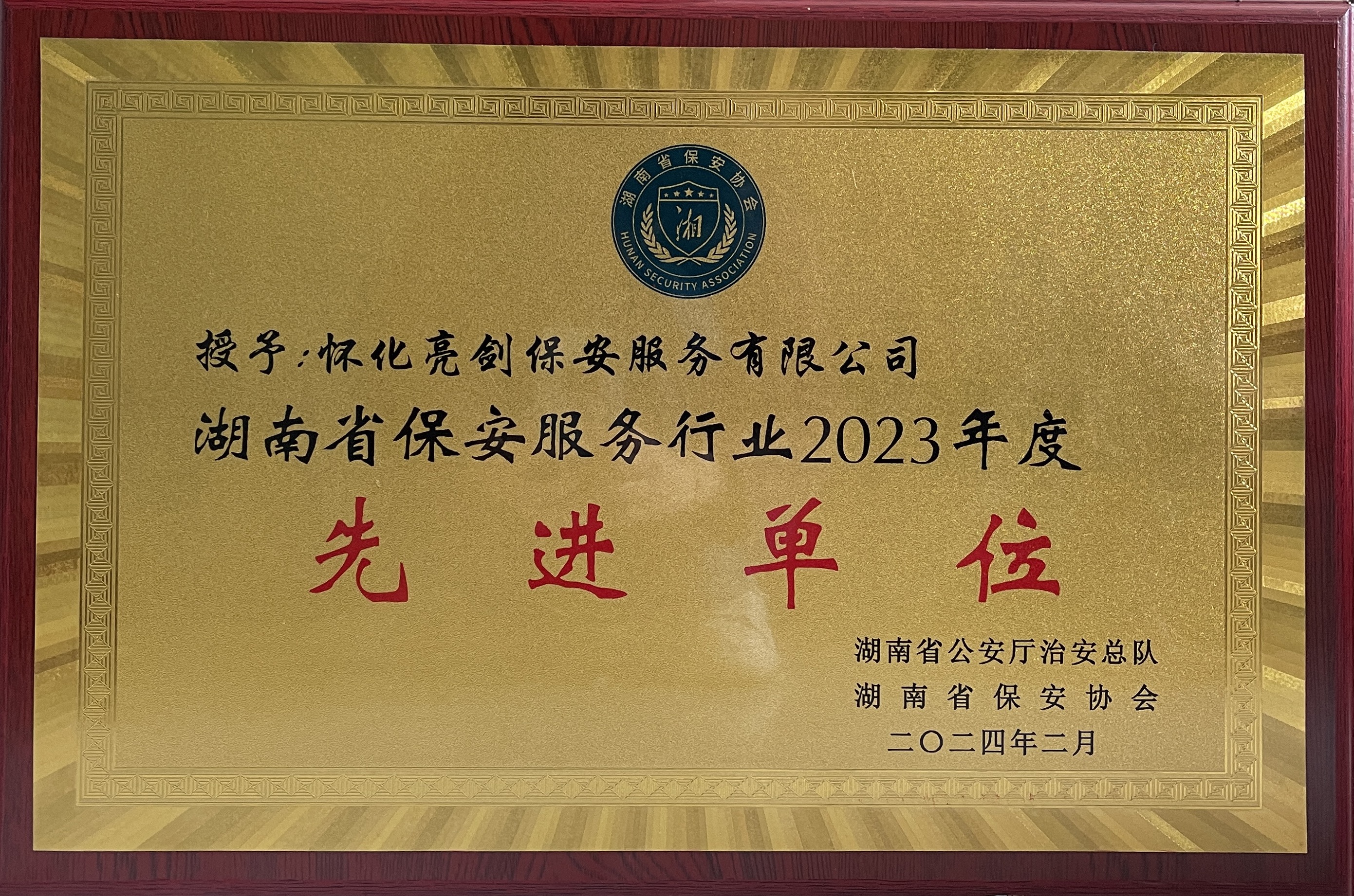 2023年,懷化亮劍保安服務(wù)有限公司、懷化金劍保安服務(wù)有限公司堅(jiān)持以習(xí)近平新時(shí)代中國(guó)特色社會(huì)主義思想為指導(dǎo),深入貫徹習(xí)近平法治思想,全面貫徹黨的二十大精神,牢牢把握保安服務(wù)工作總體要求,忠實(shí)履職服務(wù)大局,深耕保安服務(wù)主業(yè),著力加強(qiáng)自身建設(shè),各項(xiàng)保安服務(wù)工作取得新跨越。據(jù)湖南省保安協(xié)會(huì)《湖南省保安服務(wù)行業(yè)2023年度先進(jìn)集體、優(yōu)秀個(gè)人通報(bào)》,懷化亮劍保安服務(wù)有限公司榮獲湖南省保安服務(wù)行業(yè)2023年度先進(jìn)單位,湖南省保安服務(wù)行業(yè)2023年度警保聯(lián)動(dòng)先進(jìn)單位,懷化金劍保安服務(wù)有限公司榮獲湖南省保安服務(wù)行業(yè)2023年度警保聯(lián)動(dòng)先進(jìn)單位,向其華,向紹前獲湖南省保安服務(wù)行業(yè)2023年度優(yōu)秀管理者榮譽(yù)稱號(hào),公司保安隊(duì)員楊號(hào)賢、王幽、張發(fā)香、舒經(jīng)亞等四人被評(píng)為湖南省保安服務(wù)行業(yè)2023年度優(yōu)秀保安員。